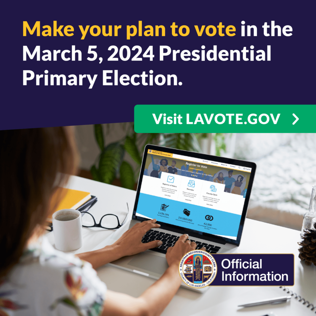 The March 5th Presidential Primary Election is quickly approaching and we want to make sure you’re ready to make your voice heard. This year, the Los Angeles County Registrar-Recorder/County Clerk has made it easier than ever to be a voter. Skip the lines and make your plan to Vote by Mail today.